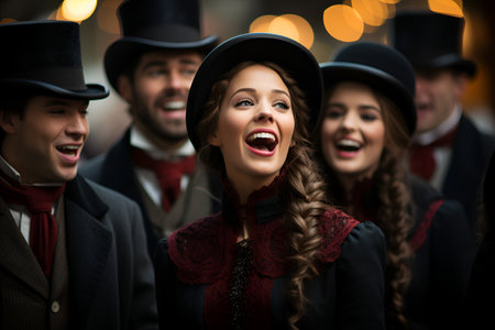 Caroling ensemble in festive attire sings traditional Christmas carols on a snowy street