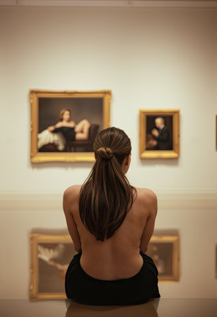 A nude woman sits facing away from the camera, contemplating artworks in an art gallery.