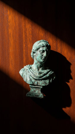 A classical marble bust of a Roman emperor or nobleman is dramatically illuminated by a single shaft of light from above, casting deep shadows. The dust particles in the light beam add to the atmospheric and historical mood of the ancient artwork.