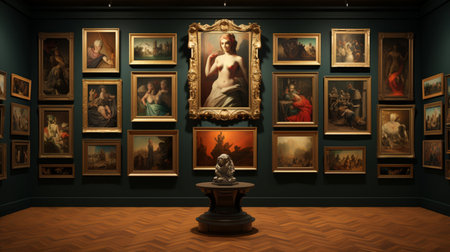 The museums hall is adorned with various artworks displayed on the hardwood flooring. The paintings are beautifully showcased in picture frames on the walls