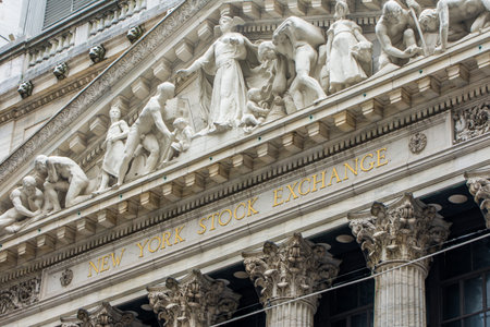 New York, US - March 29, 2018: The front facade and sign of the New York Stock Exchange at wall street