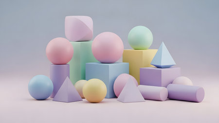 Abstract arrangement of various three dimensional geometric forms in soft pastel colors creates a visually pleasing and modern composition perfect for contemporary graphic design p