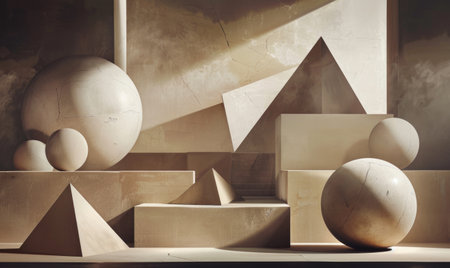 White geometric shapes including a sphere, cube, cylinder, and pyramid are arranged on a reflective surface against...