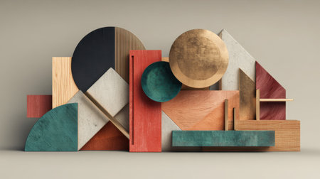This modern abstract composition features a harmonious arrangement of geometric shapes with natural textures and colors, ideal for artistic projects and creative inspiration.