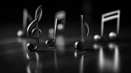 Several stylized musical notes are arranged on a reflective, dark surface. The image presents a monochromatic palette, with varying gradients emphasizing the metallic textures. The composition creates a depth of field, suggesting an indoor studio setting. Suitable for themes related to music, design, or conceptual art.