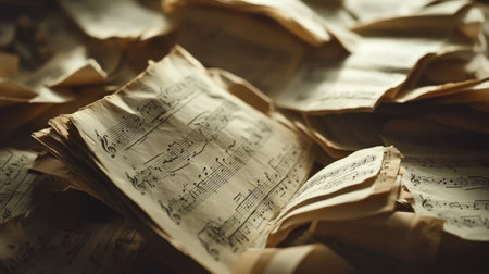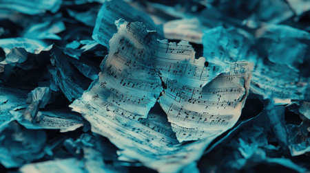 Capture a close-up of crumpled sheet music, the folds and bends telling of passionate musical performance, vividly clear --chaos 30 --ar 16:9 --v 6.1 Job ID: 7ea622cd-ebfb-47fc-8c9b-41e83b359b4d