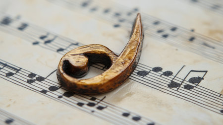 A beautiful wooden music note rests gracefully on vintage sheet music, capturing the essence of art and creativity in musical expression.