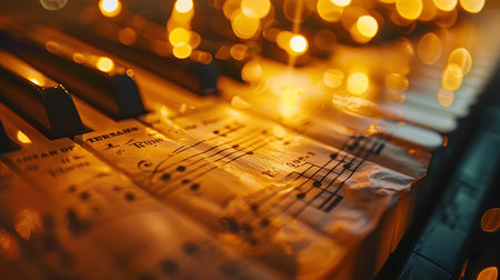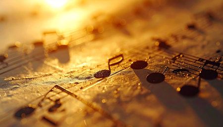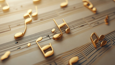 A close-up of a sheet of music with golden music notes and warm lights in the background, symbolizing creativity and harmony.