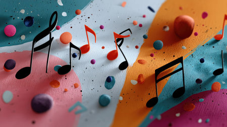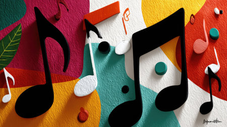 A captivating arrangement of colorful musical notes and vibrant shapes on a textured background, perfect for enhancing music-themed artwork and creative designs.