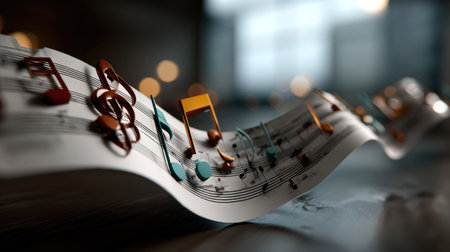 A captivating scene featuring musical notes flowing gracefully through the air, creating a sense of motion and harmony. The warm tones and soft focus background enhance the artistic feel of the composition, perfect for themes of creativity and expression.