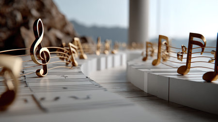 A stunning depiction of golden musical notes elegantly arranged on sheet music, set against a serene landscape backdrop, offering a blend of art and nature.