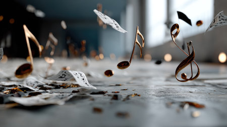 A captivating composition featuring floating musical notes and scattered sheet music, perfect for artistic projects, events, and creative expressions.