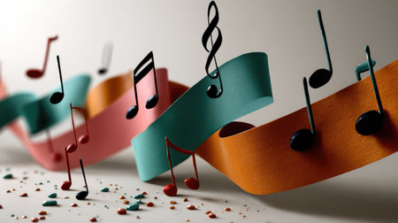 A whimsical arrangement of colorful music notes and dynamic ribbons brings a playful spirit to this artistic composition, perfect for creative projects.
