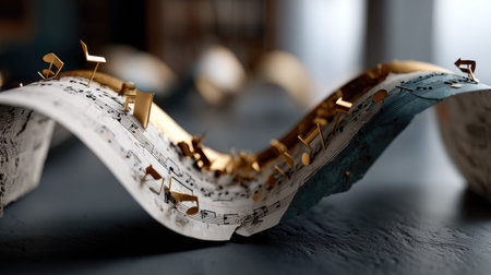 A captivating artistic composition featuring sheet music decorated with miniature instruments and golden elements, perfect for creative projects and music-related themes.