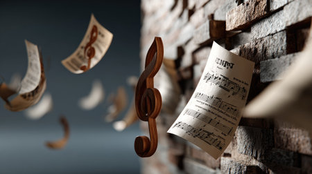 This artistic image features floating musical notes and sheets of paper against a textured brick wall, creating a dynamic and inspiring atmosphere.