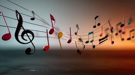 A dynamic arrangement of colorful musical notes flows gracefully across a vibrant gradient background, embodying the essence of music and creativity.