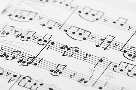 Music notes macro background, handwritten notes, selective focus