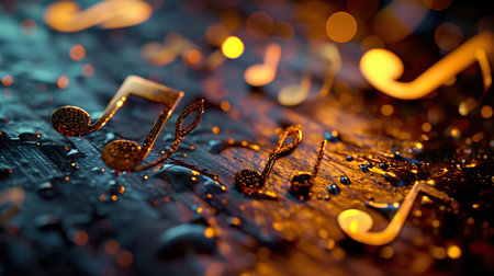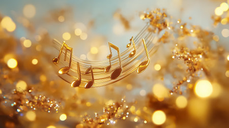 Golden musical notes create a romantic ambiance with sparkling lights gently surrounding them, evoking deep emotions.