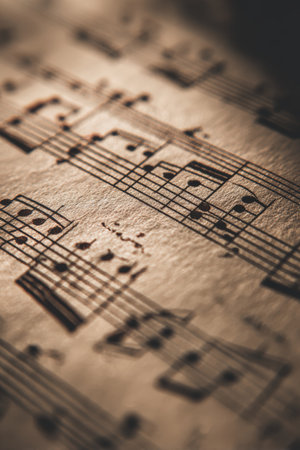 Artistic macro photograph capturing the intricate details of musical notation. Features a minimalistic style with a calm tone and warm vintage lighting, highlighting the texture.