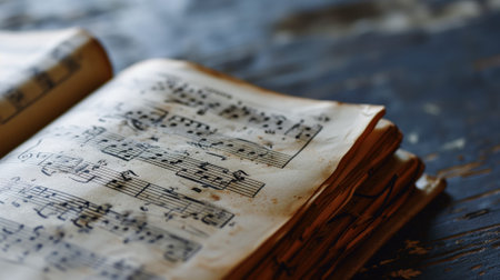 Old sheet music on a wooden surface with vintage patina