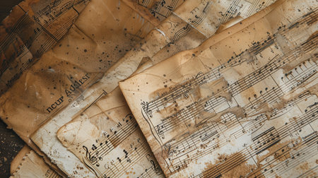 Ancient sheet music resting on top of a stack of vintage music sheets, concept of nostalgia and music history