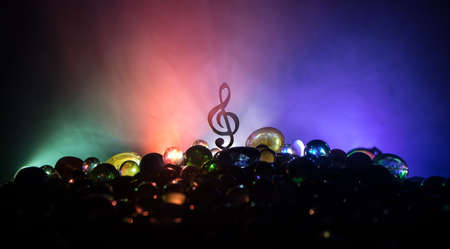 Music concept. Musical symbol treble clef stainless steel miniature with colorful toned light on foggy background. Selective focus