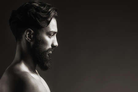 Handsome and unshaven. Young man in profile. Profile portrait of caucasian guy