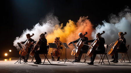 A stunning symphony performance captured on stage, highlighting musicians immersed in their art with colorful smoke effects creating a dramatic ambiance.
