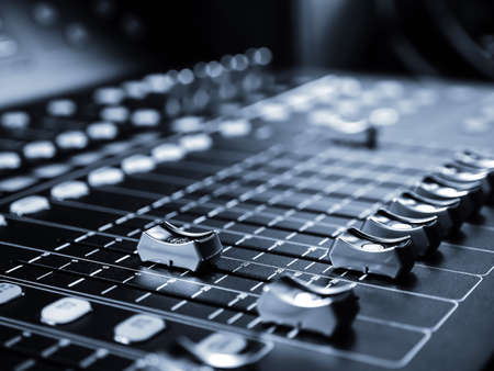 Professional audio mixer console with black knobs to equalize sounds. Audio recording studio tool. Music and entertainment concept
