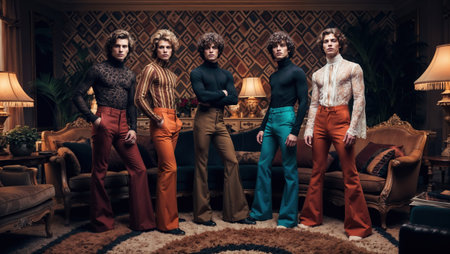 Five male models are posing in a vintage house, wearing colorful 70s fashion