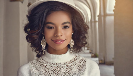 Beautiful african american woman in beret and white dress