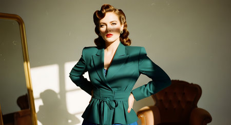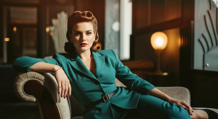 Portrait of a beautiful young woman in a blue suit. Retro style.