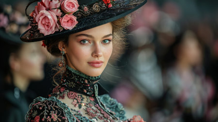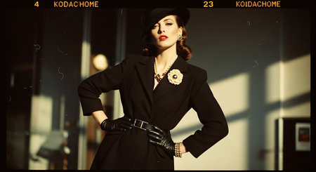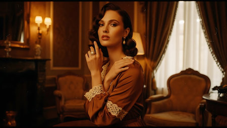 Elegantly poised woman in vintage-inspired fashion, with a backdrop of classic floral patterns and warm tones
