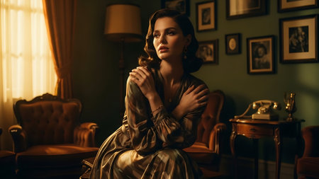 Portrait of a beautiful young woman in the interior. Retro style.
