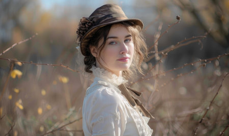 Soft light highlights a young woman dressed in period attire, with delicate fabrics framing her gentle features. She exudes a serene and timeless beauty.