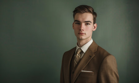 Portrait of a young man in a tailored brown suit against a muted green background