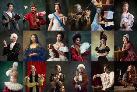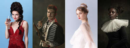 Set of images of actors and actress in image of medieval royalty persons from famous artworks in vintage clothes on dark background. Eras comparison concept