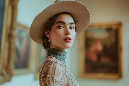 Elegant young woman with curly hair wearing white lace blouse standing in bright museum gallery admiring artwork on walls.