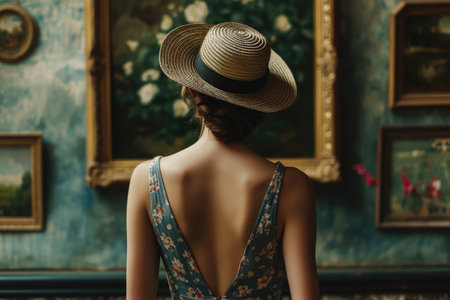 a model wearing a hat and a dress in a museum with a painting.