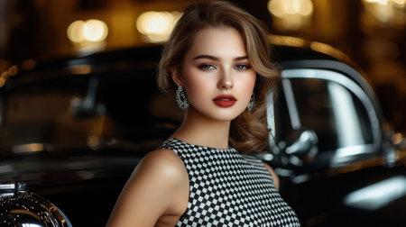 A woman is standing in front of a black car. She is wearing a black and white dress and red lipstick