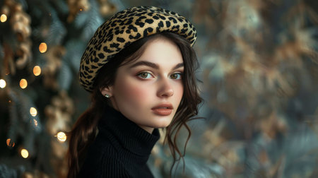 A woman wearing a leopard print hat and a black shirt. She has a greenish tint to her eyes