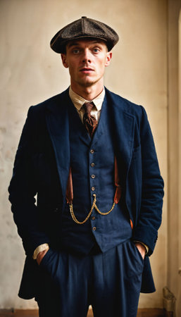 A stylishly dressed man in a classic suit and cap poses confidently against a dark backdrop during an indoor photoshoot in autumn