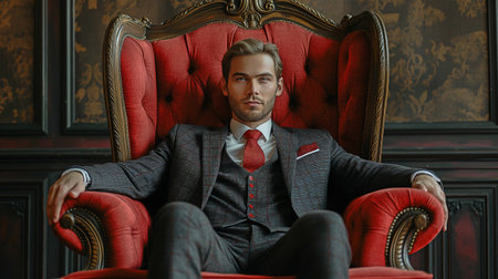 Man Seated in a Red Chair with a Suit and Tie