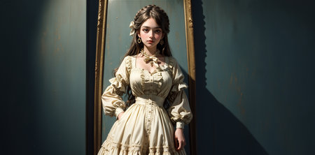 A stylish woman in vintage clothing stands gracefully in front of an antique mirror, embodying elegance with her dark hair and thoughtful expression.