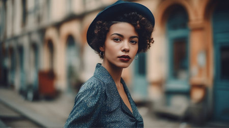 A young woman in a stylish hat looks directly at the camera in a street setting. AI-generated.