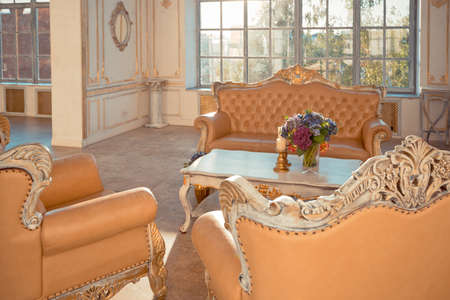 Luxury interior of a classic royal house. Sofa, armchairs, table and other furniture.