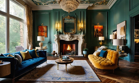 A royal and elegant living room design featuring a vintage fireplace, ornate decor, and cozy seating.