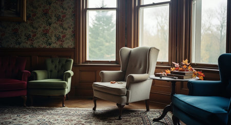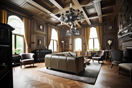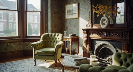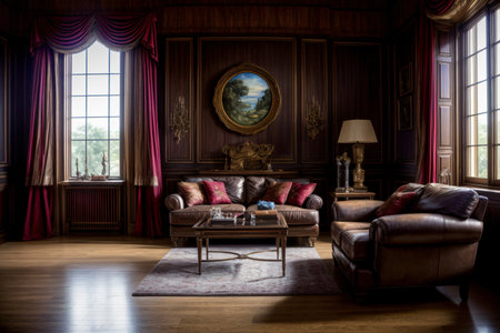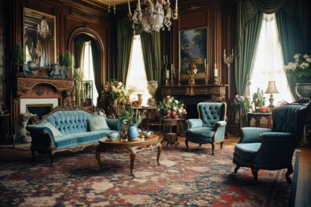 a wide-angle shot of a room with victorian furniture, ornate rug, and elegant draperies, created with generative ai