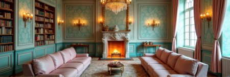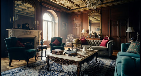 Elegant vintage living room with fireplace and chandelier in classic mansion library. That the image is generated using AI.