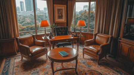 A luxurious office space featuring classic wooden furniture, large windows with city views, and warm lighting, perfect for a professional setting.